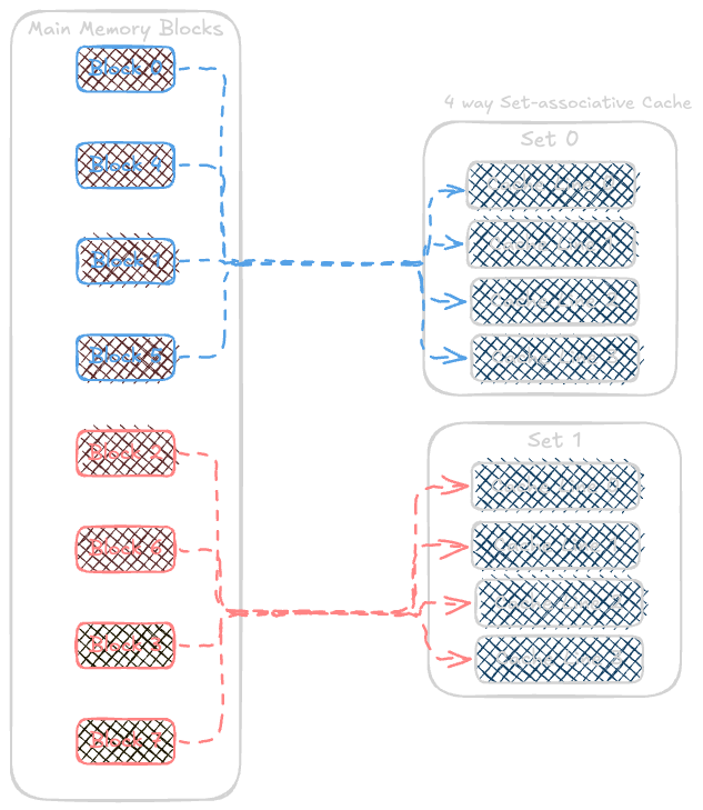 Set-Associative Cache: The cache is divided into sets, and each block of memory can map to any line within a specific set