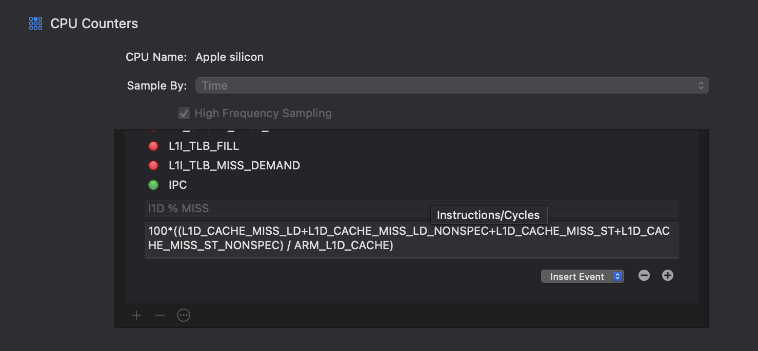 we can also perform realtime arithmetic on these PMs to get usefule metrics, eg: in the image below I created formulae for IPC and & l1D cache misses.